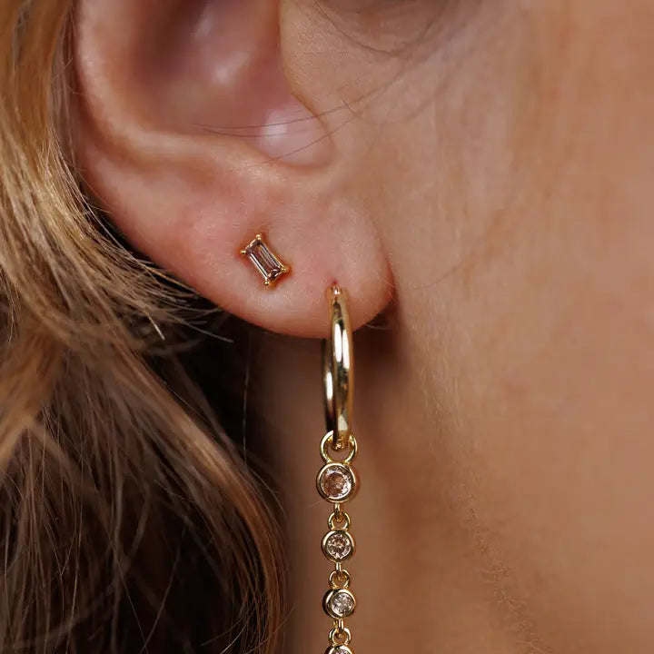 A customer favorite, our coffee baguette is made for stacking! Featuring a petite polished stone cut into shape and set in an 18k gold-plated prong earring over sterling silver.