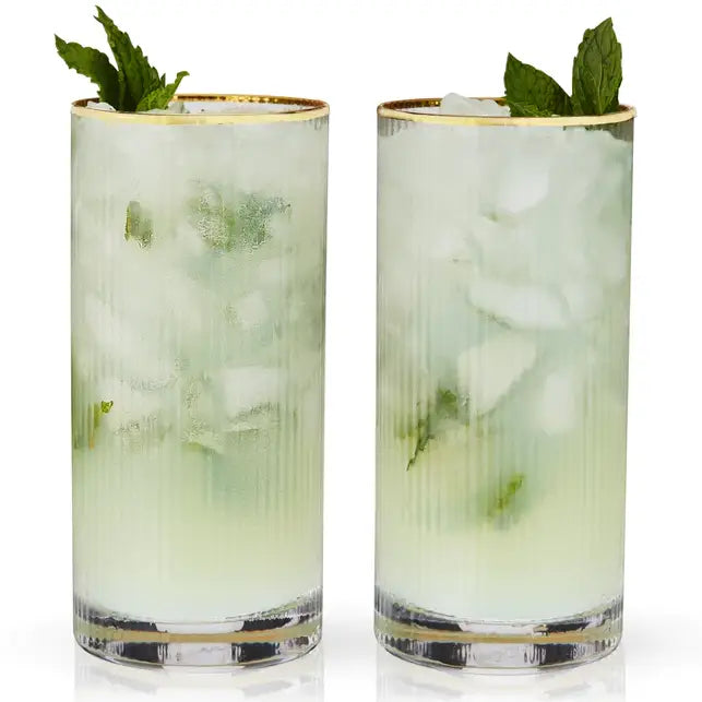 With the stunning clarity of lead-free crystal and a sleek rippled texture, this pair of gold-rimmed highball glasses brings understated elegance to any cocktail. This glassware has a subtly contemporary shape that enhances your sipping experience and complements any decor style.