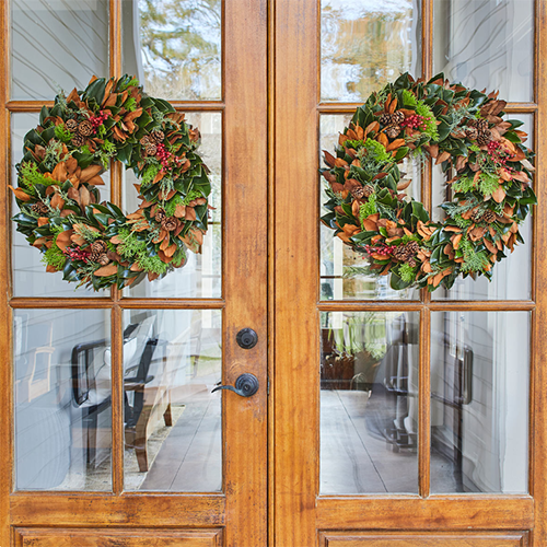 Handcrafted with farm-fresh magnolia leaves, Carolina Sapphire, red berries, and miniature pinecones. A classic holiday design that captures the warmth and beauty of the season—perfect for your front door or mantel.