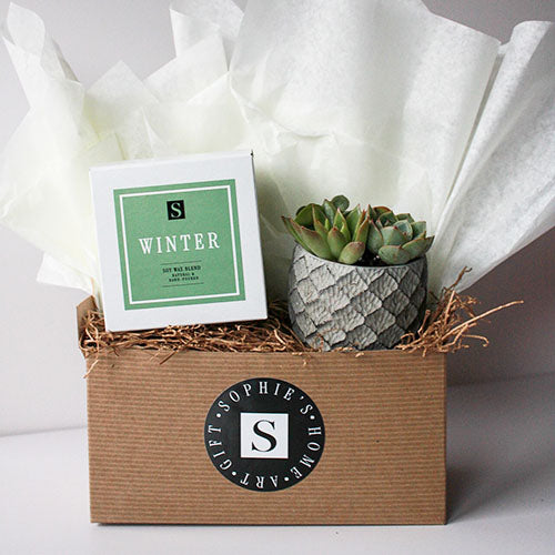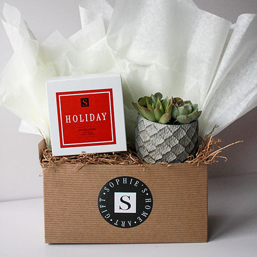 The Lattice + Seasonal Candle Gift Box is a beautiful combination for any holiday occasion. The lattice-patterned, ceramic container is a matte grey with a mix of stunning succulents. Choose from our Seasonal scented candles: Forest, Holiday, Winter or Fireside.