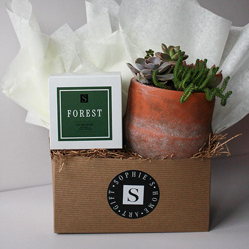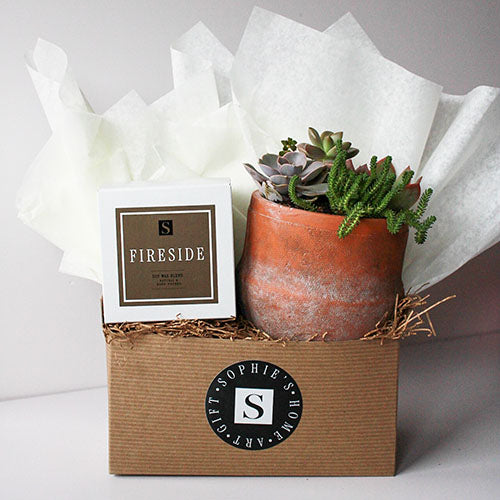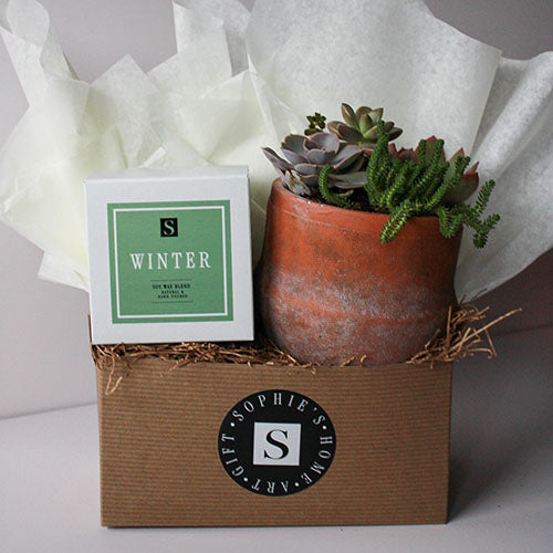 The Terra Jar Succulent + Seasonal Candle Gift Box makes such a sweet holiday gift! This gift box features an assortment of succulents in a distressed terra cotta pot, along with one of our Sophie's Seasonal candles. Choose your scent: Forest, Holiday, Winter or Fireside. Perfect gift for any occasion - dinner party, birthdays, thank yous, "thinking of you," and more!