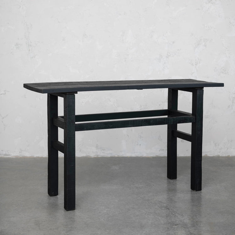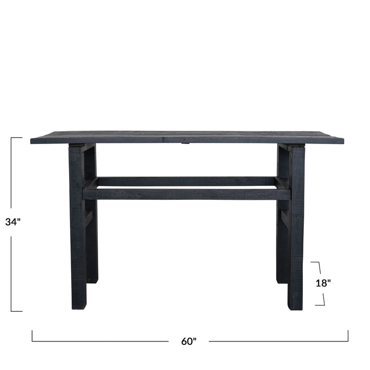 This elegant Reclaimed Wood Console Table in Black is a versatile and stylish piece that showcases the natural beauty and character of reclaimed wood. It has a spacious 1 inch thick top and a metal base with a black finish, creating a stunning contrast. It can be used to display or store items, or as a stylish buffet or workspace. It comes in a knock-down form for easy assembly and disassembly and has a weight capacity of 440 pounds. It blends seamlessly with rustic, farmhouse, and industrial interior styles, adding some history and charm to any room.