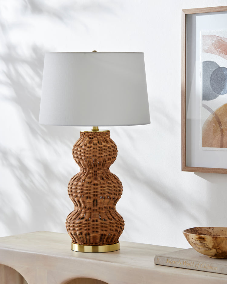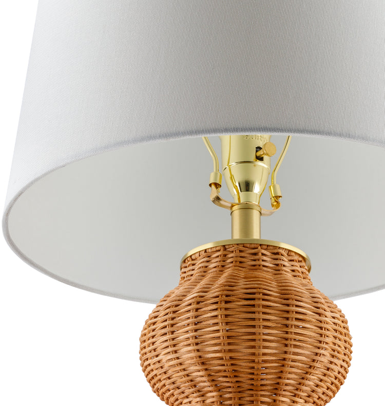 Transform your space with the Cazorla Lamp! The exquisite rattan body and elegant white shade add a touch of sophistication to any room. Brighten up your living space and indulge in the cozy glow of this stylish lamp.