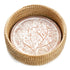 Whitewashed terracotta stone is incised with a nature-inspired design and sits within a handwoven kaisa grass basket with dyed palm wrap detail. Warmer is oven safe. A popular gift item! Dimensions: 3 1/2"h x 11"dia.