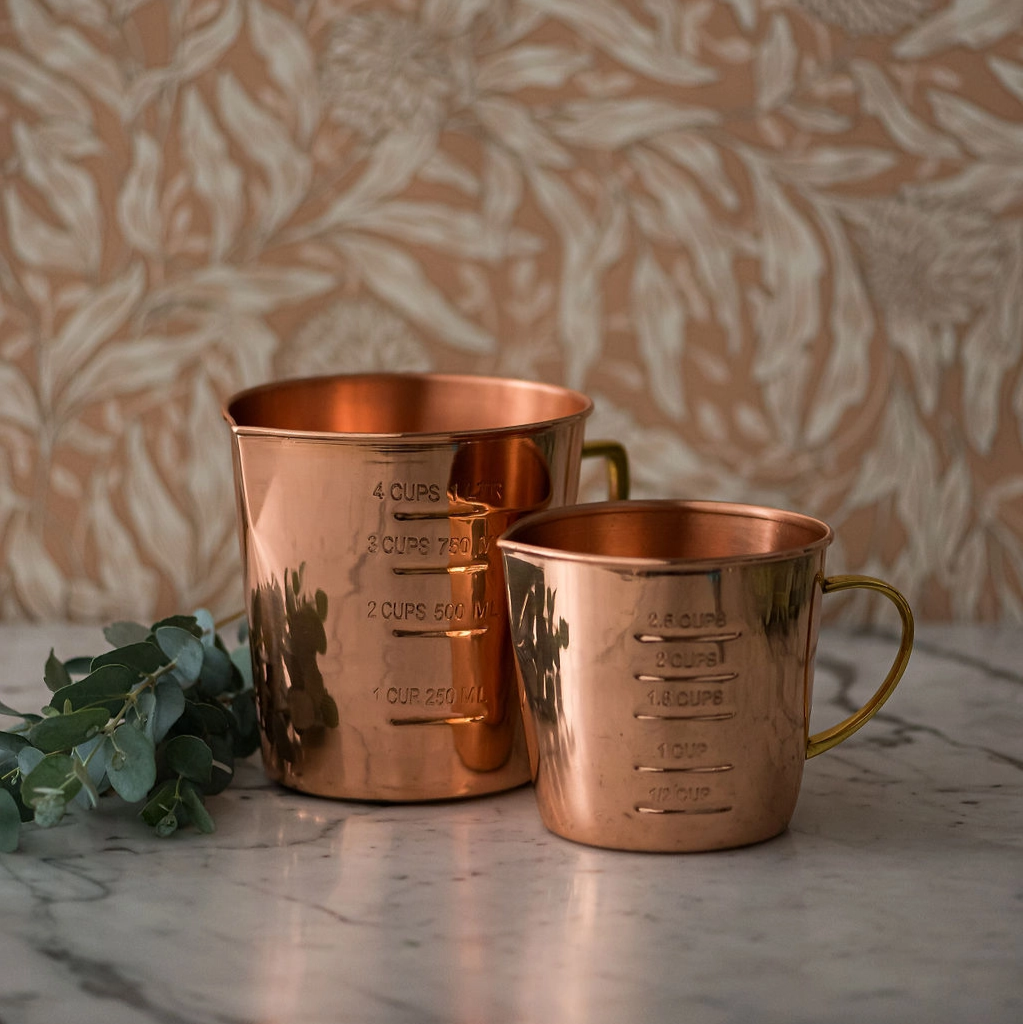 Experience the perfect blend of form and function with our Copper Liquid Measuring Cup! The elegant copper design adds a touch of beauty to your kitchen while the interior and exterior markings make measuring a breeze. The brass handle adds both durability and style.