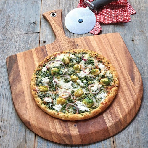 Bake pizzeria-style in the comfort of your own home. Made of gorgeous acacia hardwood, this pizza peel is functional and beautiful due to its rich, shimmering colors. Its slanted edge allows for easy scooping up and sliding off of the pizza. It features a sturdy handle with a wider base that gives a secure grip and helps reduce slips. This pizza peel also includes a grommet for wall hanging and flexible storage options. This attractive pizza peel can also be used as a serving board for charcutie, cured meats and cheeses, bread, appetizers and more!