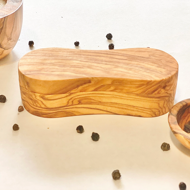 Swivel top lids on a two section keeper is great for salt and pepper or your favorite spices. There are no chemicals or sealants on the wood. They are all natural and coated with only olive oil. Olive wood is dense and durable for everyday use. It is also nonporous so germs and odors are not retained.