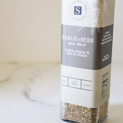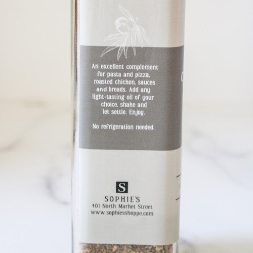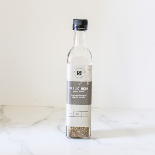 Our Garlic & Herb Olive Oil Infusion bottle is a lovely local gift for foodies of any kind. Including a fresh ground mixture of spices, all you have to do is add a light-tasting oil of your choice, shake + let settle, then enjoy! The ingredients are all natural, freshly ground blends made from the highest quality spices. Use on pizza and pasta, roasted chicken, in your favorite sauces, or as dipping oil for crusty bread…there’s so many ways to enjoy this locally made and inspired gift!