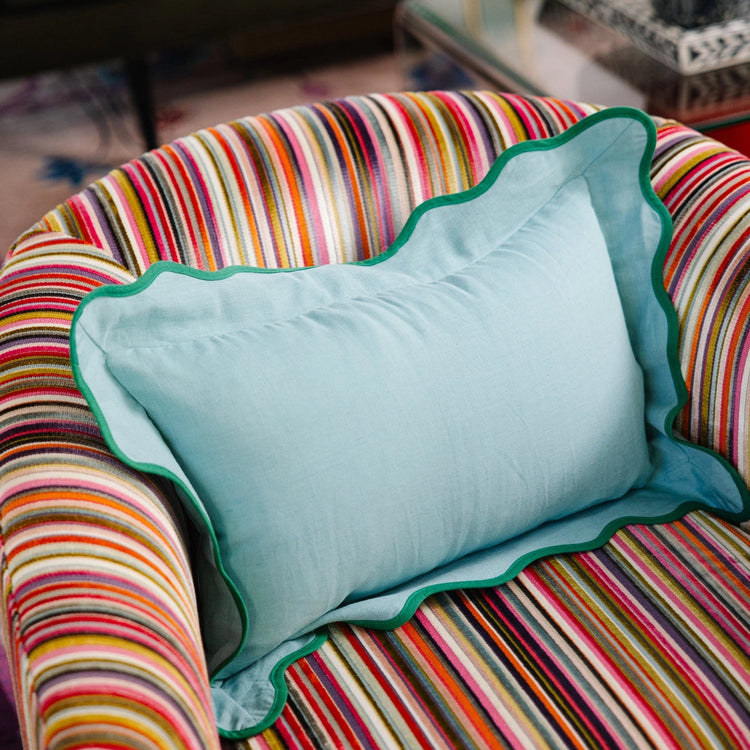 Very chic yet very sweet, our luxe linen pillows with scalloped edges are the perfect luxe layer to add to your mix. Bright colors with a contrast trim makes for a signature look. Includes a lush down alternative insert slightly larger than the pillow case to ensure a full stuff.