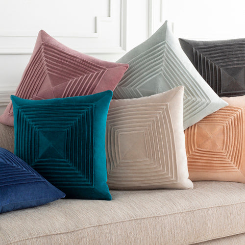A beautiful, ice blue pleated throw pillow made of velvet. It works well for both a couch or bedroom.
