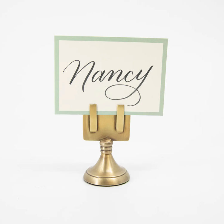 These elegant brass place card holders add a touch of sophistication to any event. With their sleek design and sturdy construction, these holders will beautifully display your guests' names while also complementing any table setting. Elevate your next event with these stylish and practical place card holders.