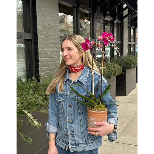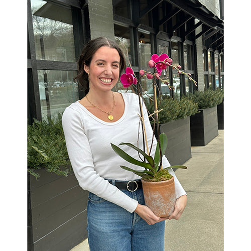 This beautiful double-stem Phalaenopsis Orchid is the perfect gift for your Valentine. Beautifully potted and finished with moss and sticks. Potted in a cute terracotta pot.