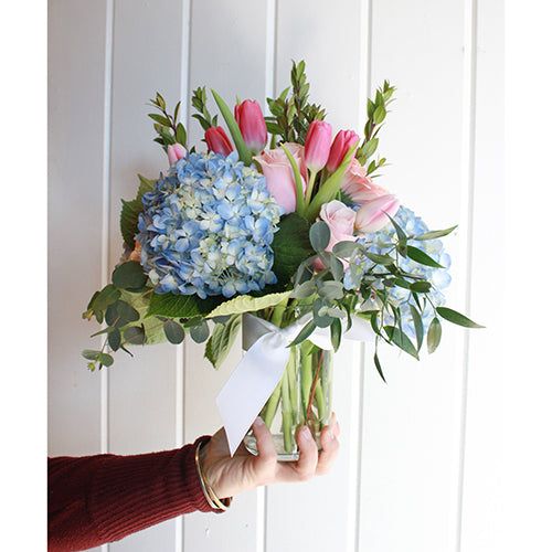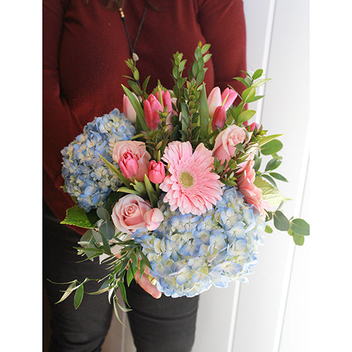 Our Lovely Arrangement features a lush bouquet of full blue hydrangeas, pink tulips, pink roses with beautiful greenery. They're sure to love this beautiful gift!