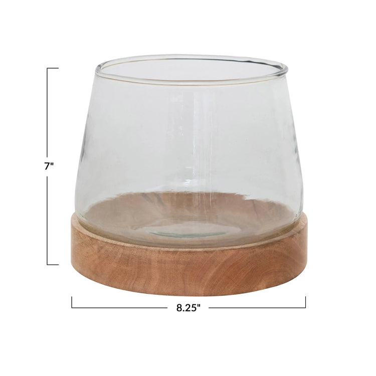 A contemporary candle holder with a sleek glass bowl and a stylish mango wood base. Suitable for any home decor style, especially modern, rustic, or Scandinavian. Perfect for creating a cozy and elegant mood on a dining table, a mantelpiece, a console table, or a side table. Made of high-quality glass and mango wood.