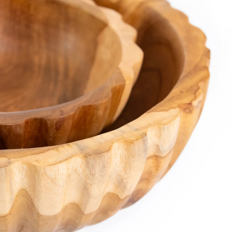 Carved in a beautiful scalloped edge pattern and made from gorgeous natural teak wood, our Scalloped Teakwood Catch-All Small Bowl is imported from Indonesia and is perfect for a variety of home decor uses, especially collecting all your odds and ends! There are slight variations from one to the next in colors and finish, which make these truly unique and one of a kind.