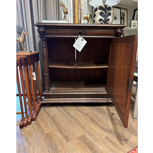 Framed by carved columns and topped with a substantial molded cornice, the cupboard offers both visual presence and practical storage. Behind the paneled door, interior shelving provides versatile space for linens, serveware, or household essentials, making it equally suited for dining rooms, living spaces, or entryways.