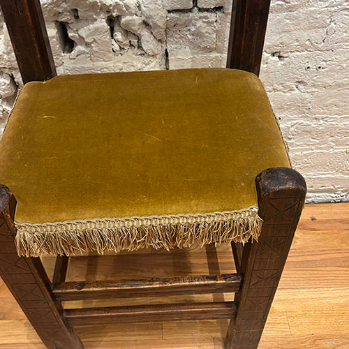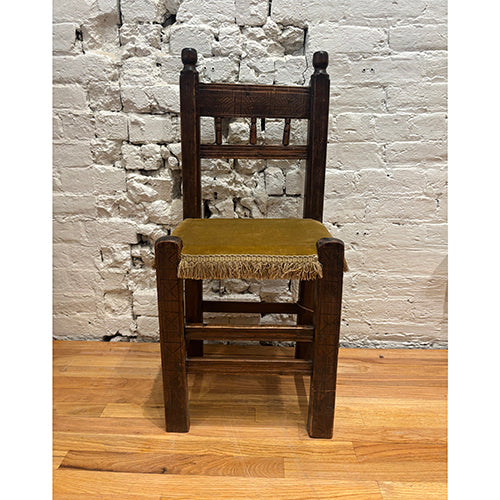 This adorable vintage carved wooden chair is full of old-world charm and character. Crafted from solid wood, it features beautiful hand-carved detailing along the backrest and legs, giving it a timeless, folk-inspired feel. The seat is upholstered in a rich yellow velvet cushion, finished with playful fringe trim that adds texture and a touch of whimsy.