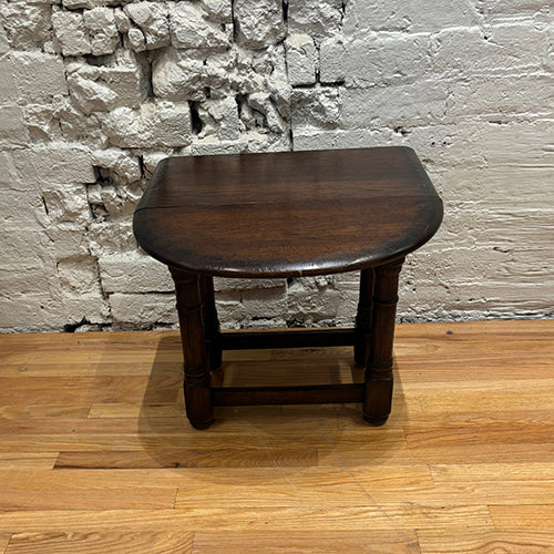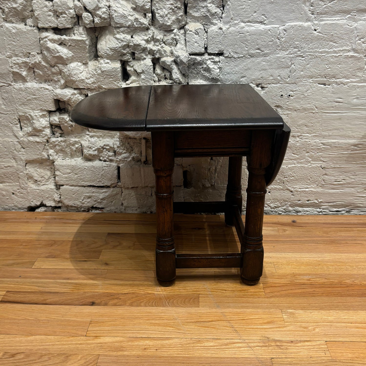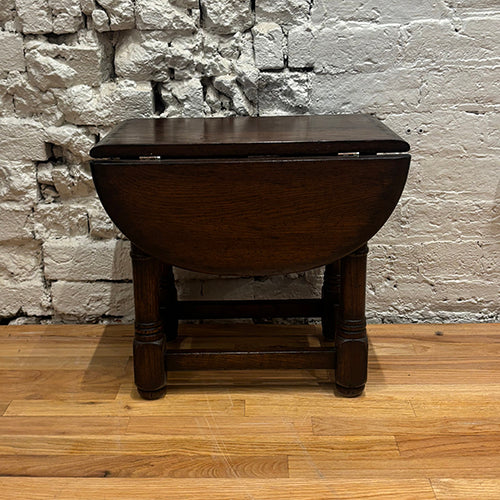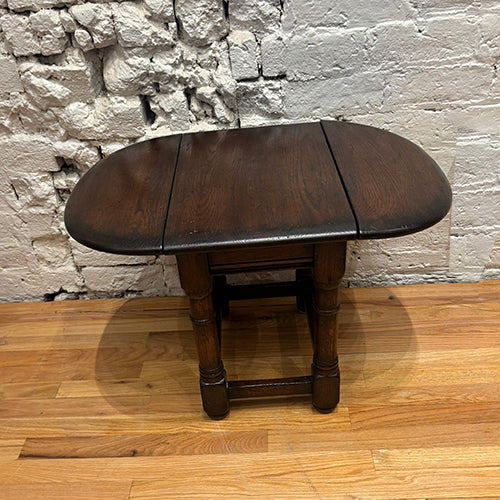 This vintage drop-leaf table is a beautifully crafted and highly functional piece, showcasing classic design and thoughtful construction. Made from solid wood, it features a rectangular top with two hinged leaves that can be raised or lowered to adjust the surface size as needed. Turned legs and a sturdy stretcher base provide both stability and traditional character.