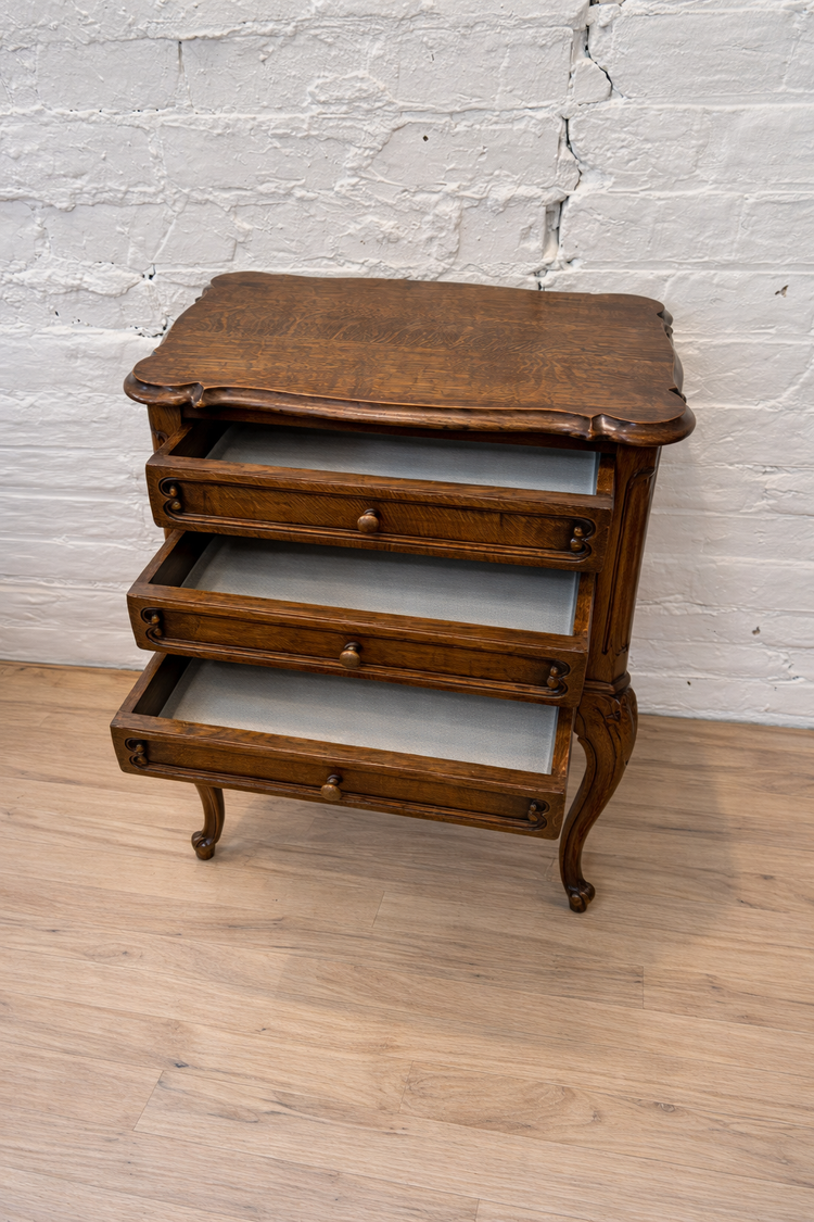 This oak French chest features three functional drawers, graceful cabriole legs, and beautifully carved details that reflect classic European craftsmanship. The warm oak tone and timeless silhouette make it a versatile piece—perfect as a bedside chest, accent storage, or layered into a curated living space. Elegant yet practical, it adds character without overwhelming a room.