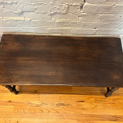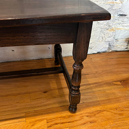 This vintage coffee table is a timeless and versatile piece, crafted from solid wood with a rich, warm finish. The rectangular top is supported by turned legs and a lower stretcher for added stability, showcasing traditional craftsmanship and understated design. The surface displays natural wear that adds depth and character without distracting from its clean lines.