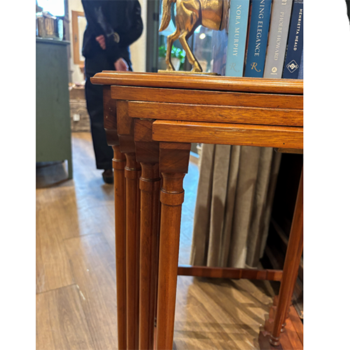 This elegant set of vintage nesting tables showcases refined craftsmanship and timeless design, featuring beautifully turned legs and a warm wood finish accented by delicate inlay detailing. The tabletops display a striking geometric inlaid motif framed by subtle banding, adding visual interest while maintaining a classic, sophisticated look.