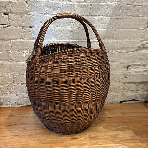 This beautifully woven vintage basket features a timeless silhouette and rich, natural patina developed through years of use. Crafted with sturdy wicker and a gracefully arched handle, it reflects traditional handwoven craftsmanship and everyday utility. The generous size and rounded shape make it both functional and decorative.