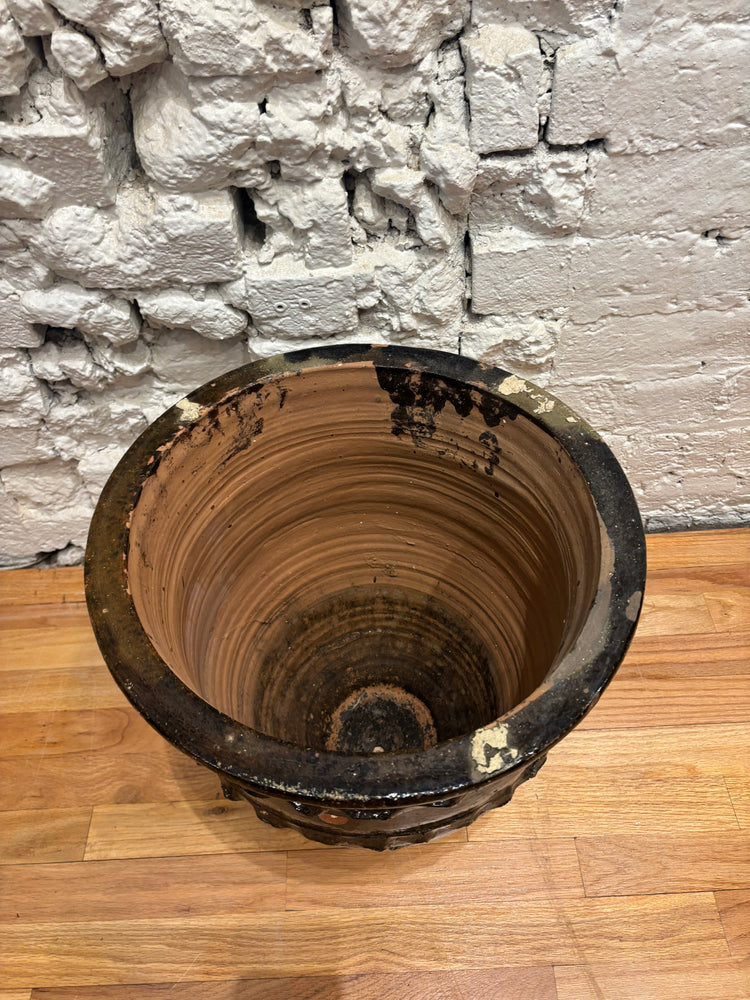 This vintage terracotta pot features a striking two-tone finish with a deep, dark glaze along the upper portion and natural clay exposed below. The contrast highlights its hand-thrown construction and gives the piece a rich, organic presence. Surface variations, glaze drips, and wear from age add depth and authenticity, making each detail part of its story.