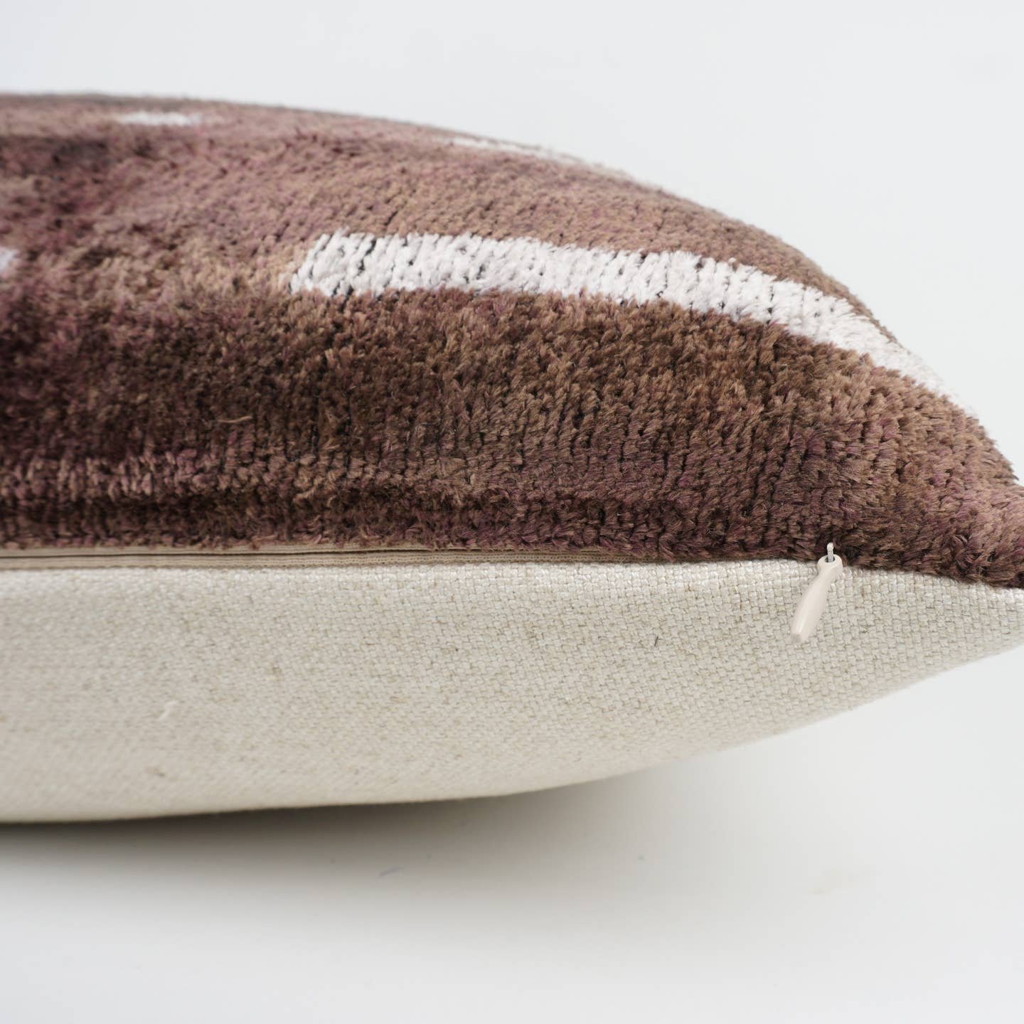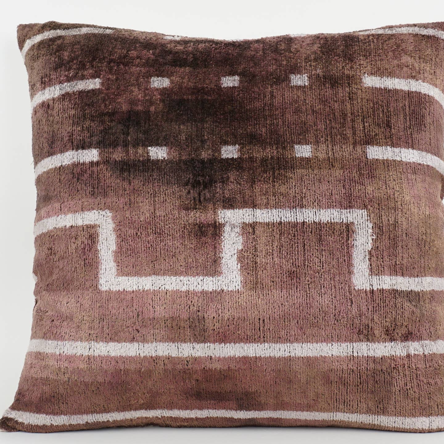 Elevate your home decor with this stunning brown geometric handwoven pillow, crafted from luxurious ikat silk and plush velvet. Its unique blend of rich colors and textures adds warmth and sophistication to any room. Experience the perfect combination of artisanal craftsmanship and comfort—an irresistible accent that transforms your space effortlessly.