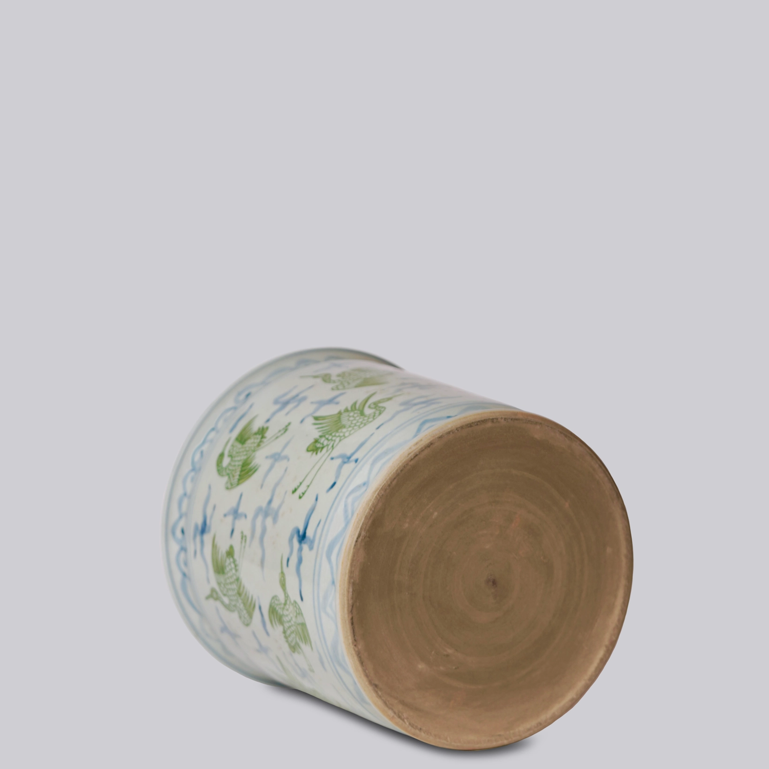 Elevate your home decor with our Cranes + Clouds Porcelain Cachepot. This unique piece features a rare green and blue underglaze, hand painted with a classic cranes pattern. Add a touch of elegance and functionality to your space with this beautiful cachepot.