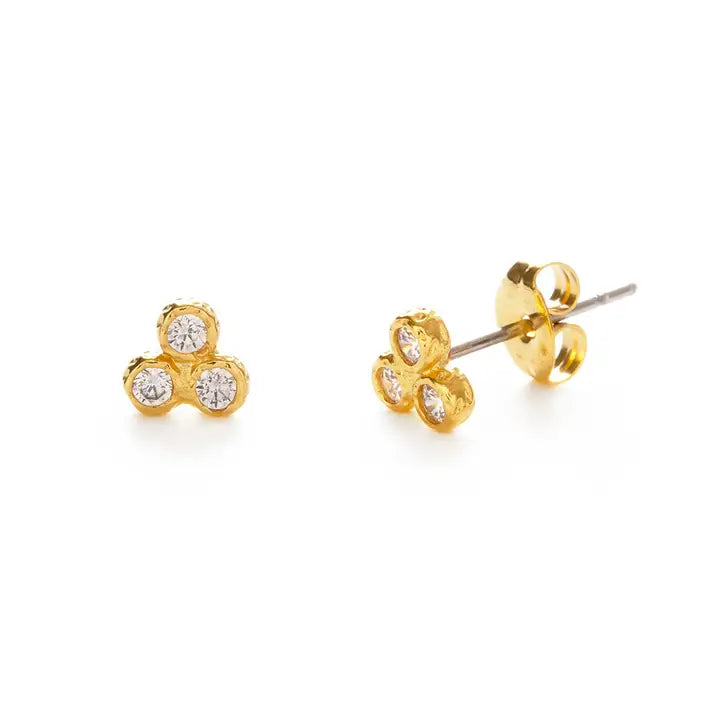 These crystal triangle stud earrings measure 5mm at the base and feature three Czech crystals set in a hand-finished wrap for a unique, artisanal feel. They include surgical steel posts and are crafted with a durable 14k gold overlay on brass.