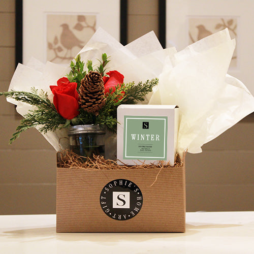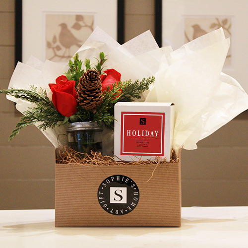 This Flower Gift Box + Seasonal Candle is a holiday favorite and a wonderful hostess gift for all your holiday parties. Also makes a great gift for Birthdays, Thank you, or Thinking of You gifts. This gift set includes a small arrangement, featuring 3 red or white roses, and a mix of filler greenery, cedar and a pinecone. Also includes an 8oz Seasonal Candle! Choose your scent: Forest, Holiday, Winter or Fireside. The flowers and candle are presented in a box with tissue paper and a handwritten card (include your message at checkout)!
