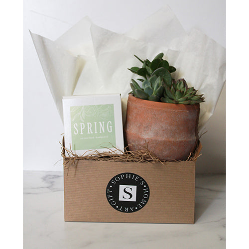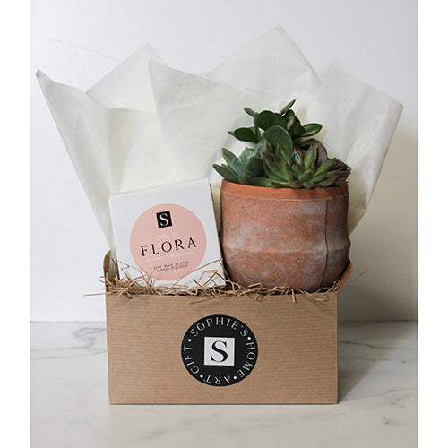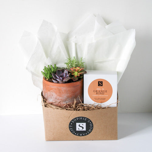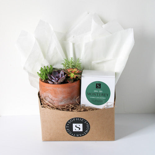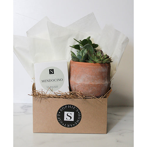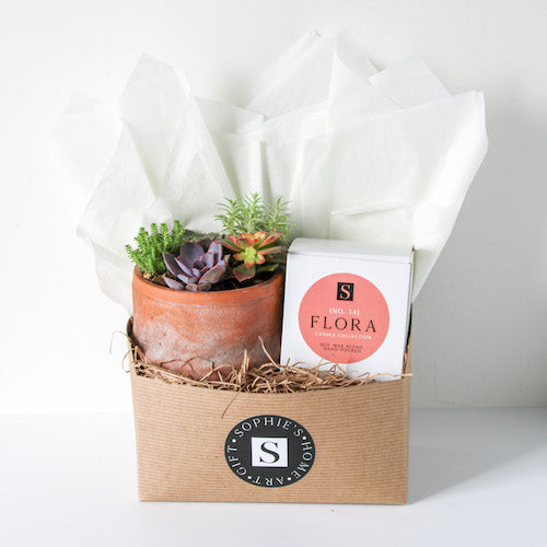 The Terra Jar Succulent + Signature Candle Gift Box makes such a sweet gift! This gift box features an assortment of succulents in a distressed terra cotta pot, along with one of our Sophie's Signature candles. Perfect gift for any occasion - birthdays, thank yous, "thinking of you," and more!