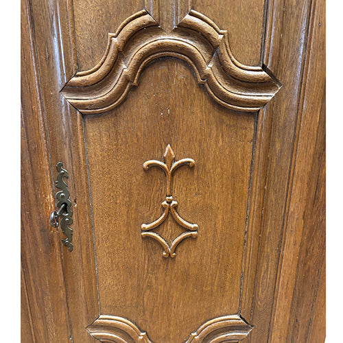 This French single-door cabinet is a beautifully crafted piece showcasing classic European design and fine detailing. Made from solid wood, it features an elegantly paneled door with carved motifs, a substantial crown molding, and original hardware. The rich wood tone and pronounced grain are complemented by a deep, timeworn patina that highlights its age and craftsmanship.