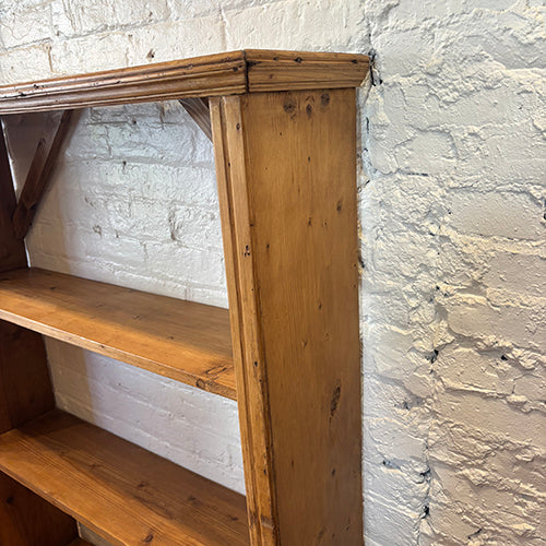 This vintage wooden shelving unit is a beautifully simple storage piece with timeless appeal. Crafted from solid wood, it features an open design with multiple shelves and subtle cross-bracing at the top for added character and stability. The warm wood tones and visible grain highlight its natural patina and handcrafted feel.